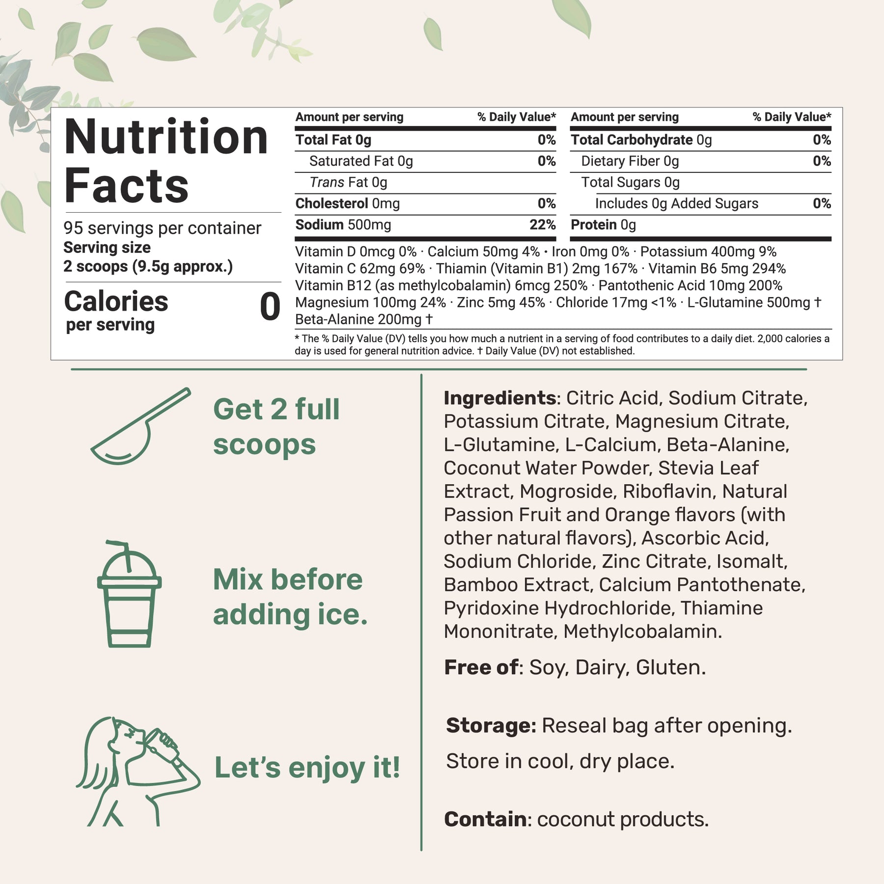Micro Ingredients Sport Electrolytes Powder features a tangy passion fruit and citrus flavor and is crafted with natural electrolytes from real coconut water, plus essential minerals, B vitamins, and key sport nutrients.