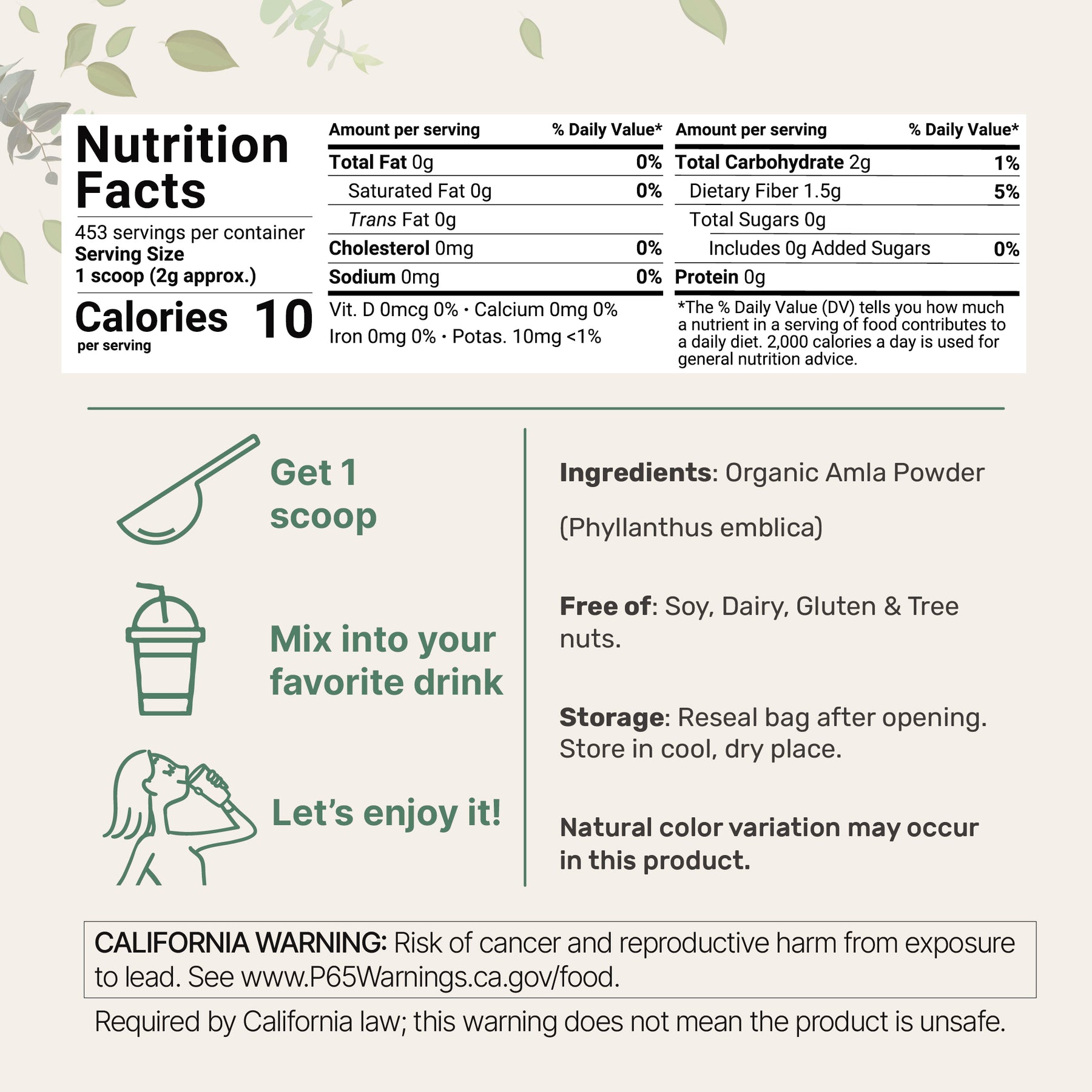 Each pouch provides 2 lbs of traditional vegan amla (Amalaki) powder as Phyllanthus Emblica. This equals a 453-day supply with every ½ scoop equaling 2g of fresh amla.