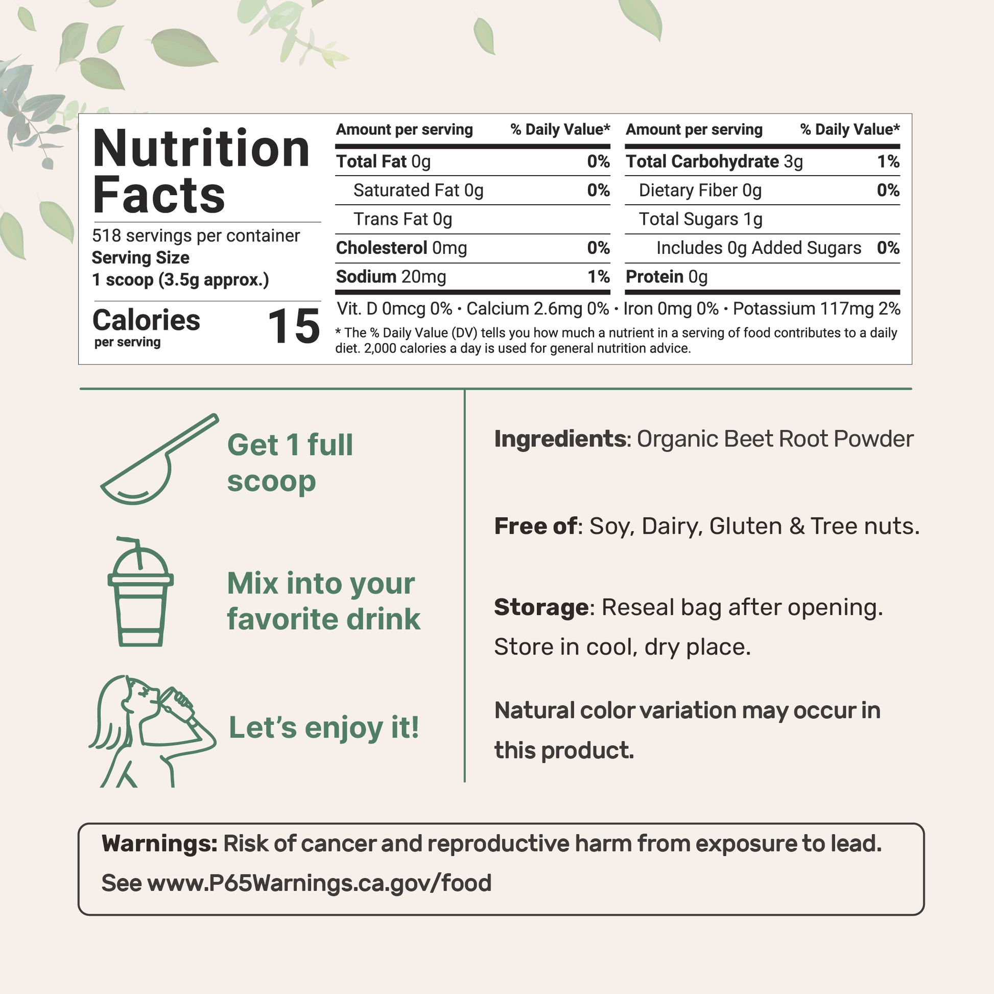 - Enjoy 4lbs of fresh beet root powder, approximately 3.5 grams per scoop, up to 518 days’ worth of servings.