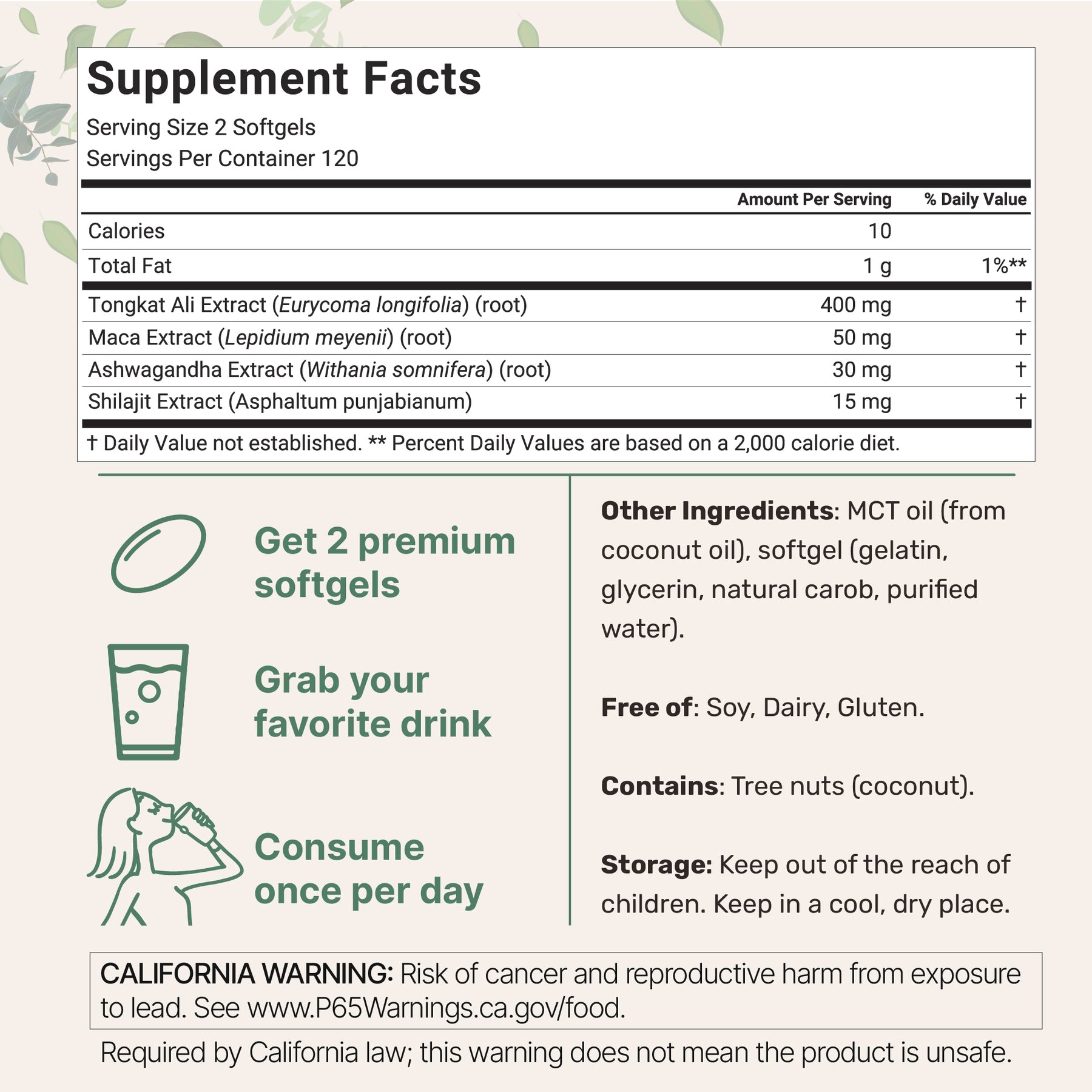 • 4-in-1 Herbal Complex: This synergistic formula delivers 400mg Tongkat Ali Extract, 50mg Maca Root Extract, 30mg Ashwagandha Root Extract, and 15mg Shilajit Extract per serving.