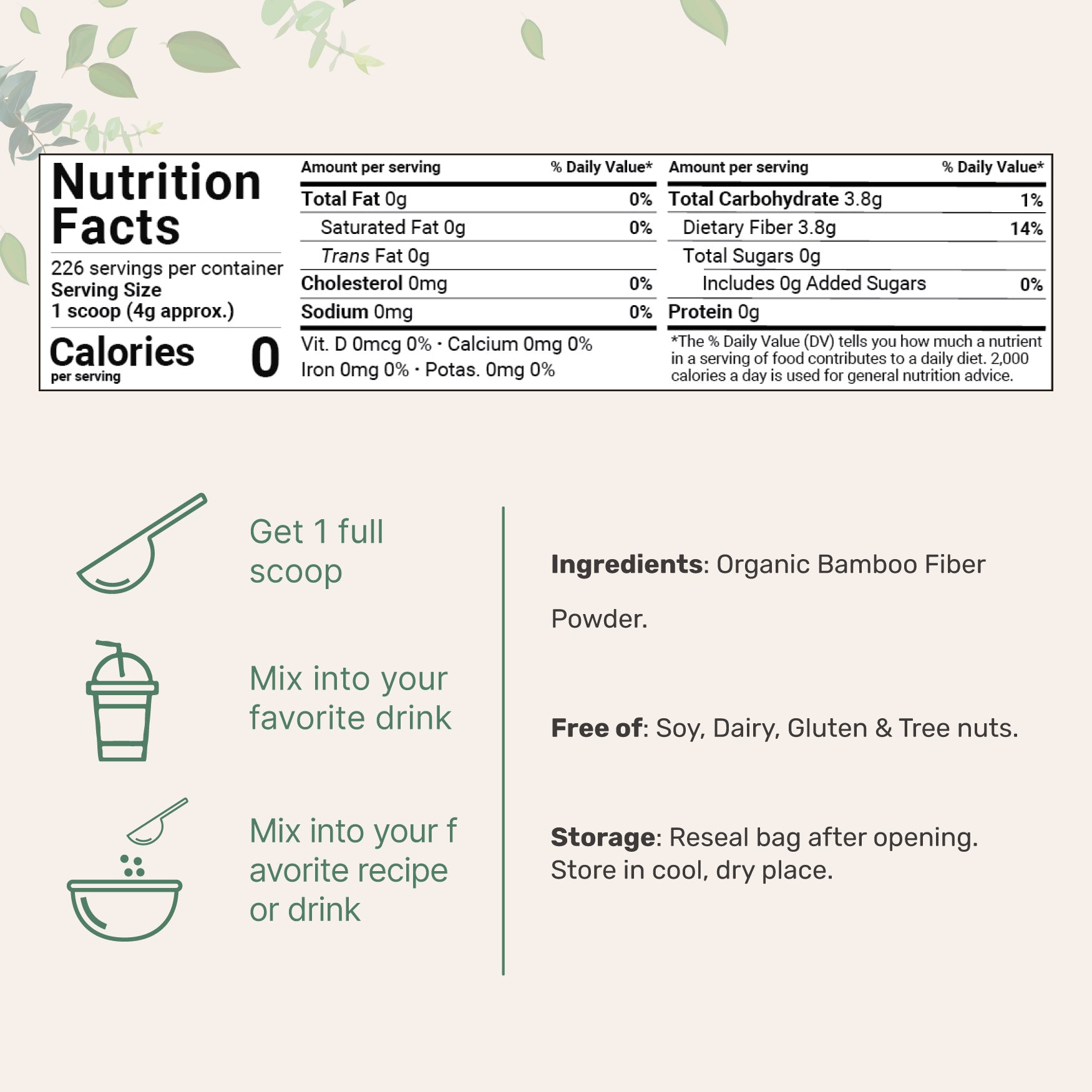 Micro Ingredients offers Organic Bamboo Fiber Powder in a 2-pound bulk supply. Just 1 scoop per serving, lasting up to a 226-day supply.