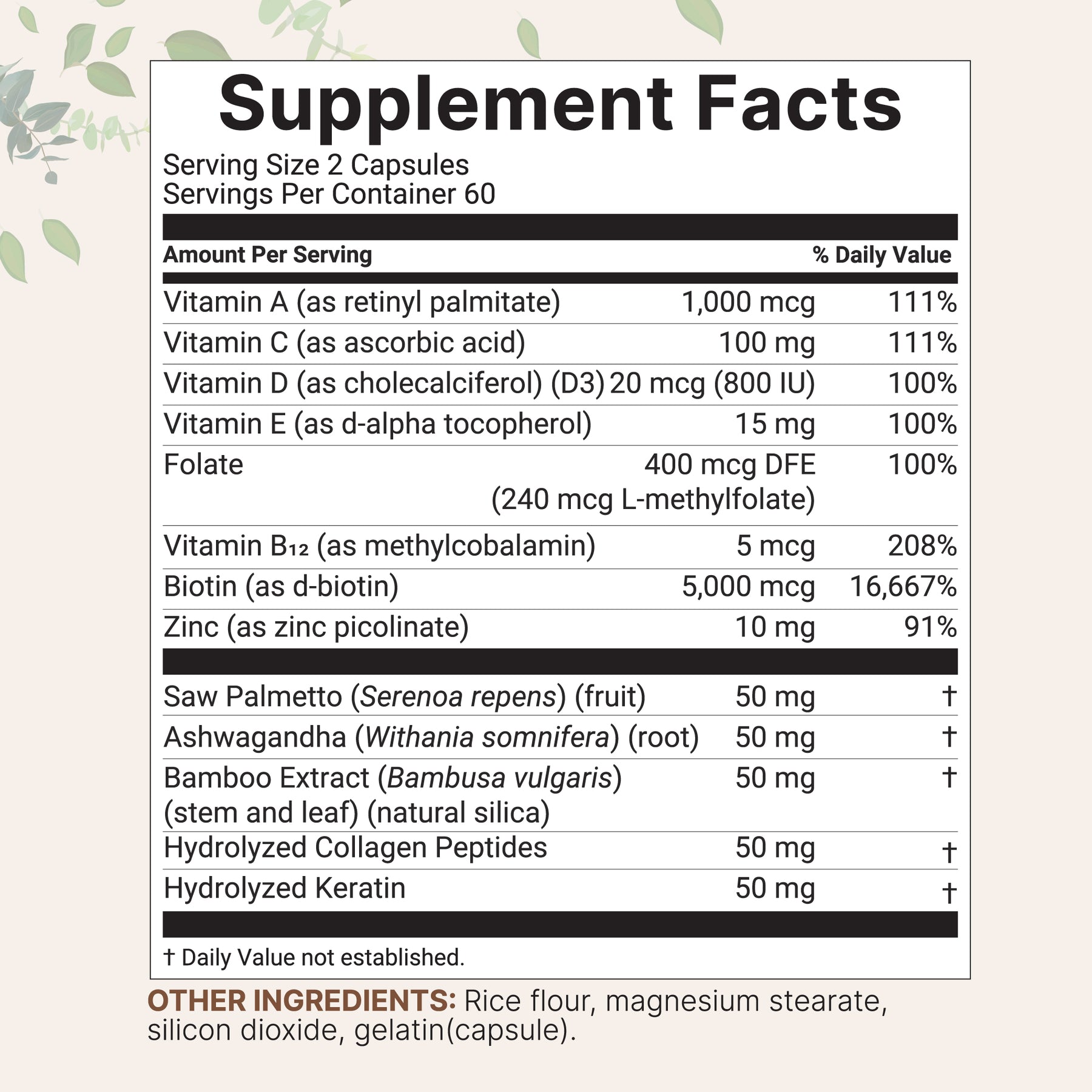 Each 2-capsule serving size provides 1,000mcg vitamin A, 100mg vitamin C, 20mcg vitamin D, 400mcg folate, 5mcg vitamin B12, 5,000mcg biotin, 10mg zinc, 500mg saw palmetto, 500mg ashwagandha, 50mg bamboo extract, 50mg hydrolyzed collagen peptides, and 50mg hydrolyzed keratin.