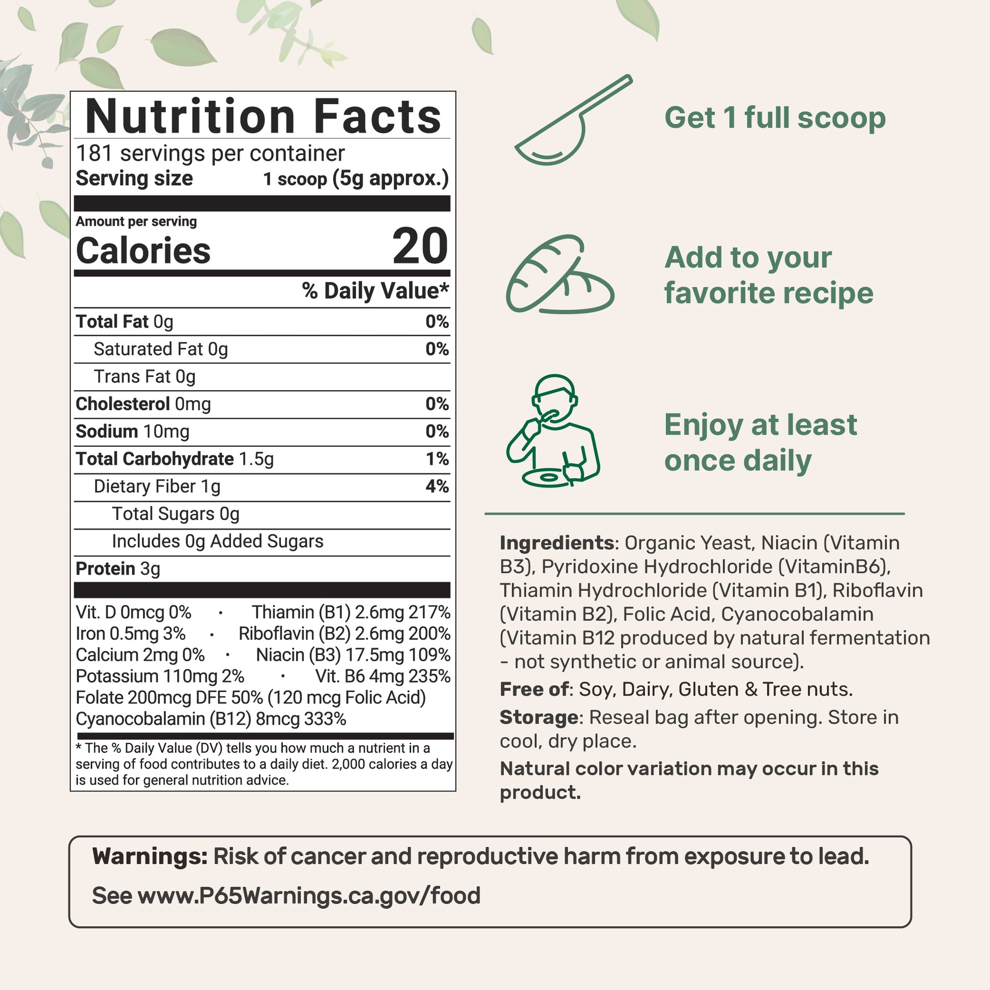 - Premium non-GMO nutritional yeast flake supplement. Made without soy, dairy, gluten, colors, and tree nuts. Ingredients must pass our 3rd party lab tests to ensure a product that is safe, pure, and potent.