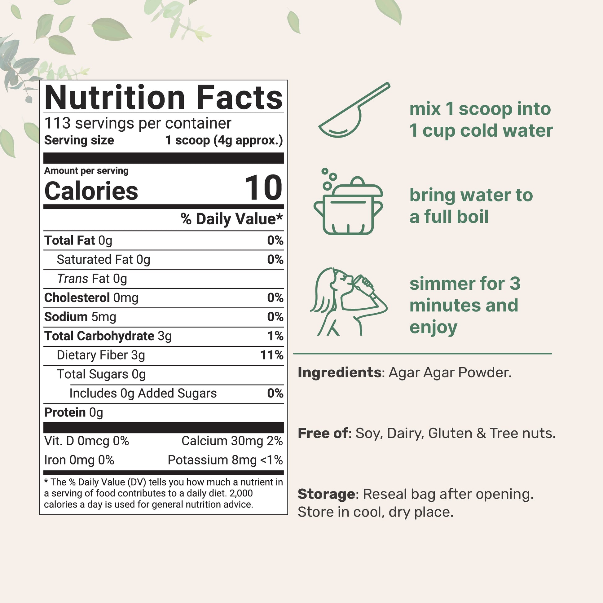 - Premium non-GMO agar agar supplement. Made without soy, dairy, gluten, fillers, preservatives, flavors, and tree nuts. Ingredients must pass our 3rd party lab tests to ensure a product that is safe, pure, and potent.