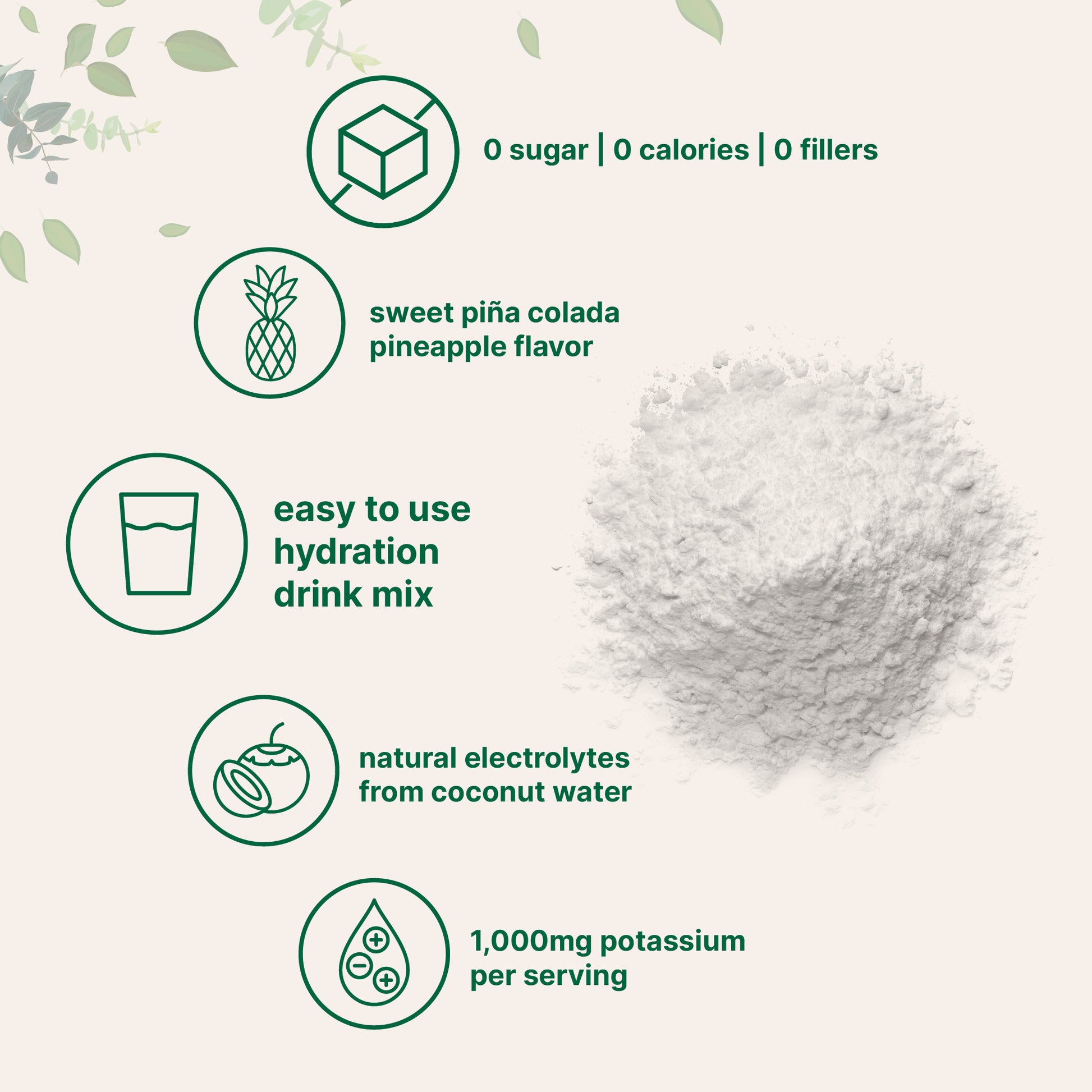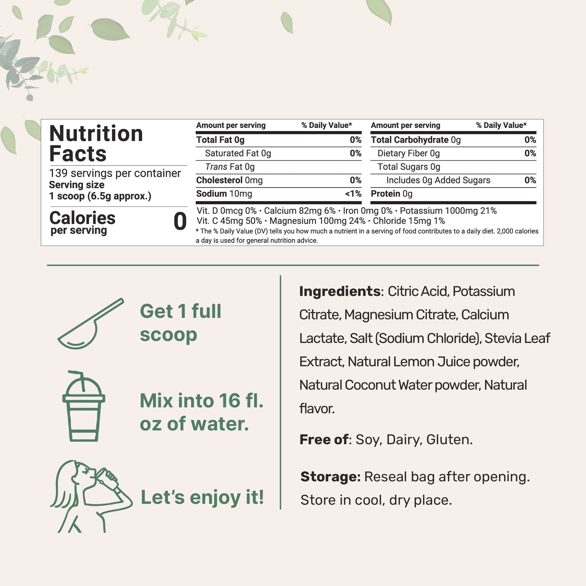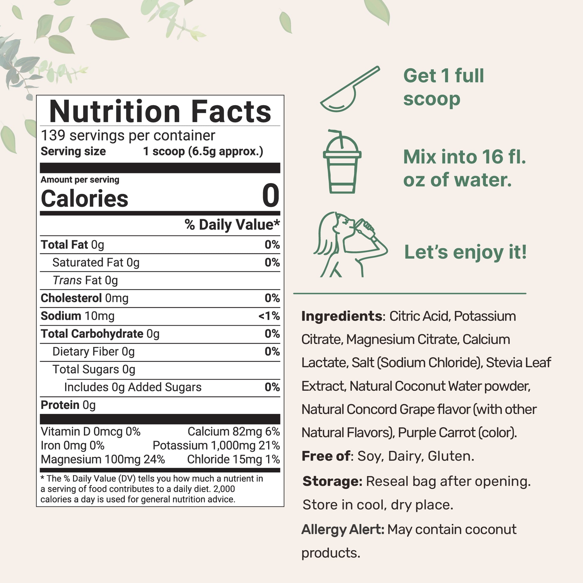 - In each 2-pound supply, enjoy 139 servings of an easily absorbed hydration drink mix. Each 6.5g scoop offers 0 sugar, 0 calories, and 0 fillers, maintaining the raw integrity of its ingredients.