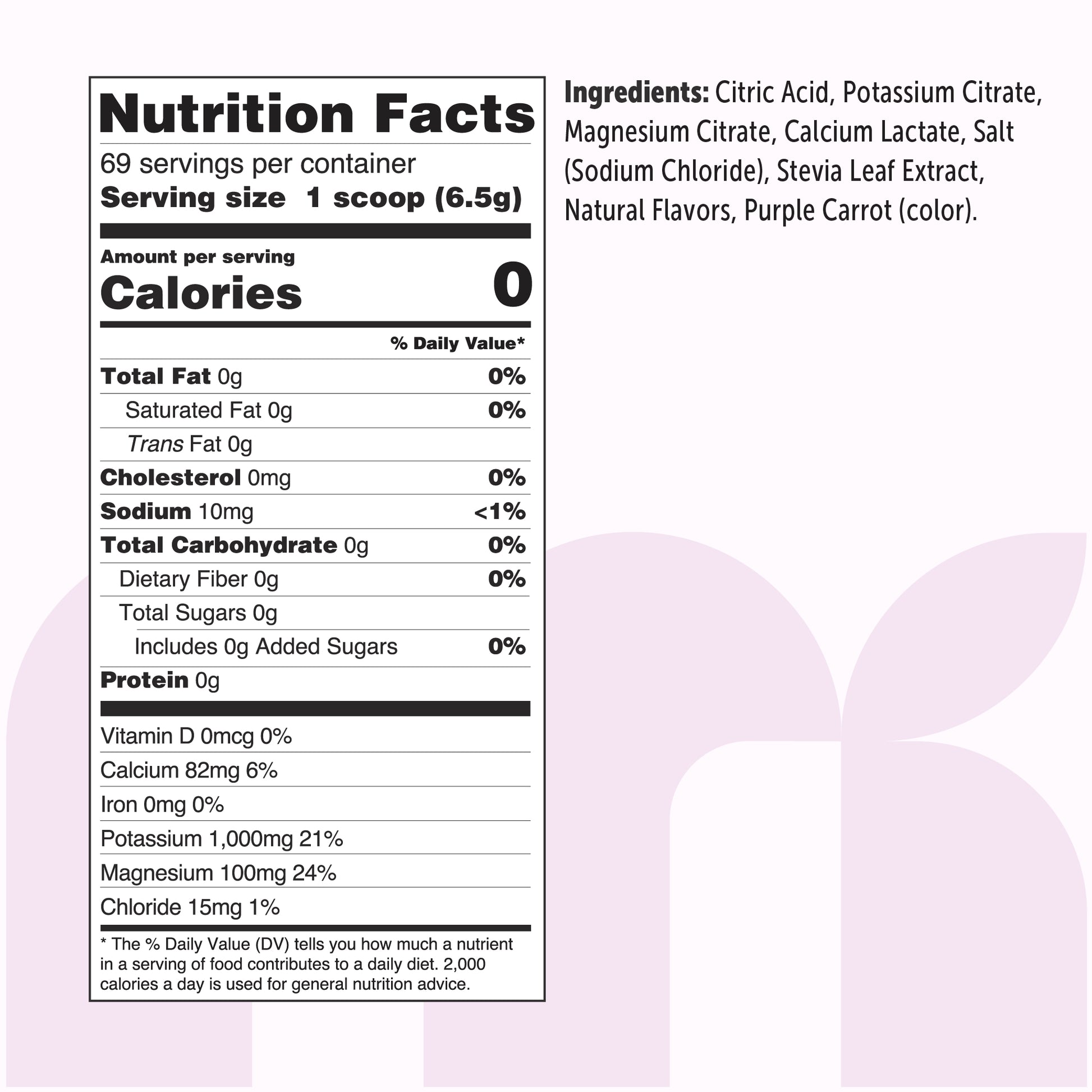 - In each 1 pound supply, enjoy 69 servings of an easily absorbed hydration drink mix. Each 6.5g scoop offers 0 sugar, 0 calories, and 0 fillers, maintaining the raw integrity of its ingredients.