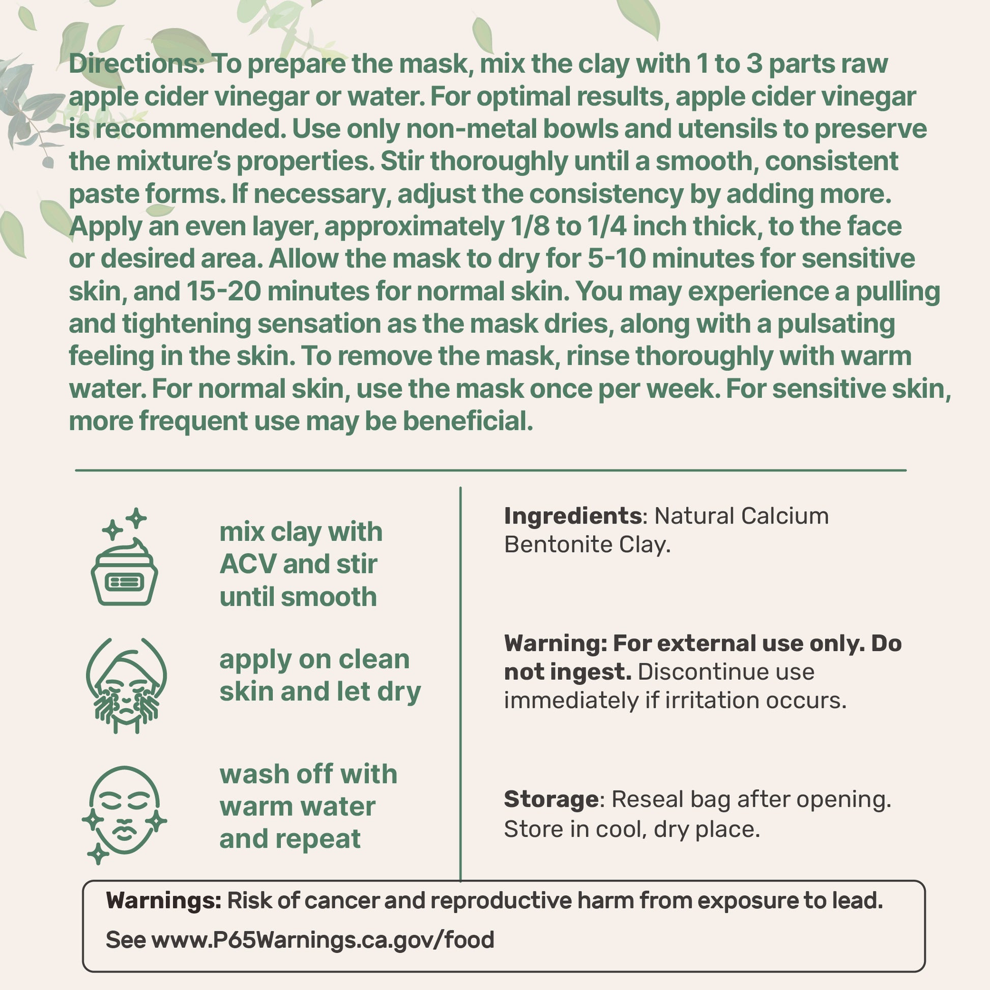 Each pouch provides 2 pounds of Natural Calcium Bentonite Clay, which calcium bentonite is known to offer gentle absorption on the skin and should be used for external use only.