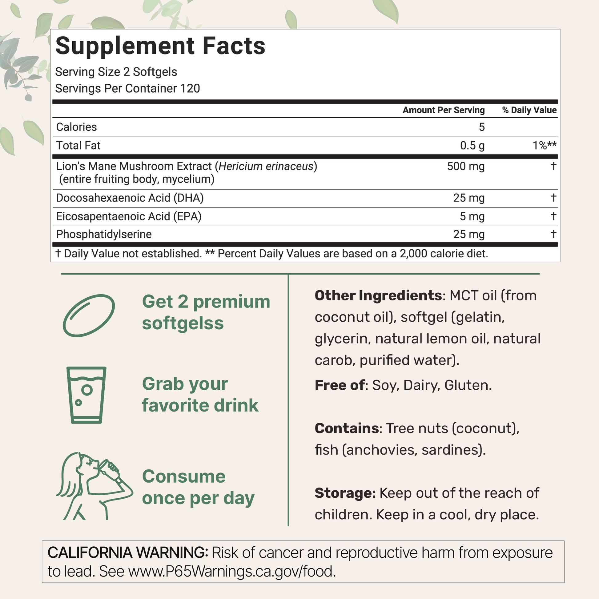 2 softgels daily – 500mg lion’s mane per serving
