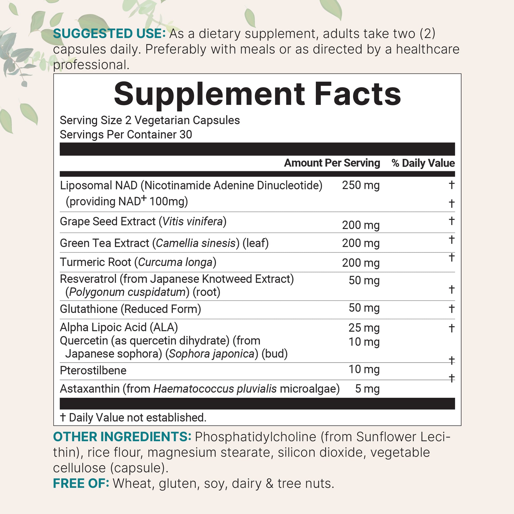 10-in-1 Advanced Formula: Combines Liposomal NAD+, Resveratrol, Grape Seed Extract, Green Tea Extract, Turmeric Root, Reduced Glutathione, Alpha Lipoic Acid, Quercetin Dihydrate, Pterostilbene, and Astaxanthin to provide a comprehensive NAD supplement complex.