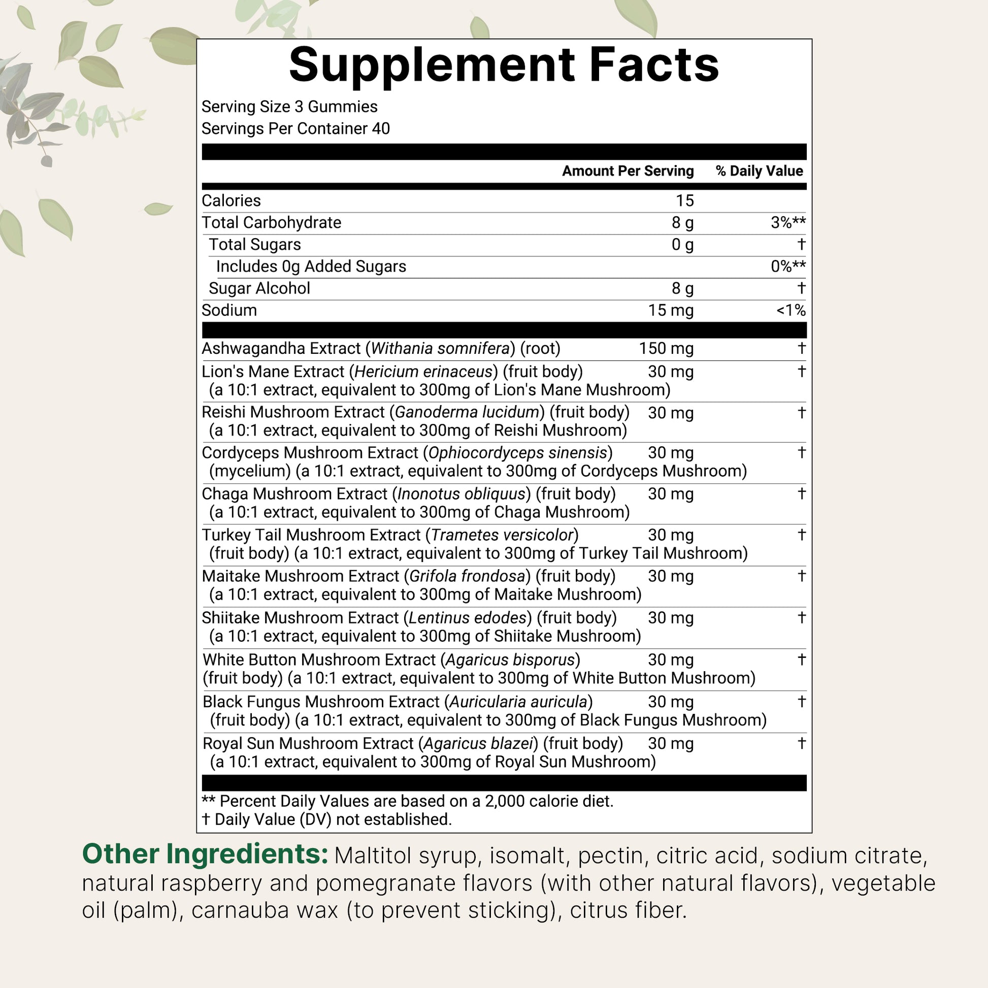 - Each bottle contains 120 gummies delivering a powerhouse of functional mushrooms, including reishi, lion’s mane, chaga, cordyceps, shiitake, maitake, turkey tail, and more, crafted to support both mind and body.