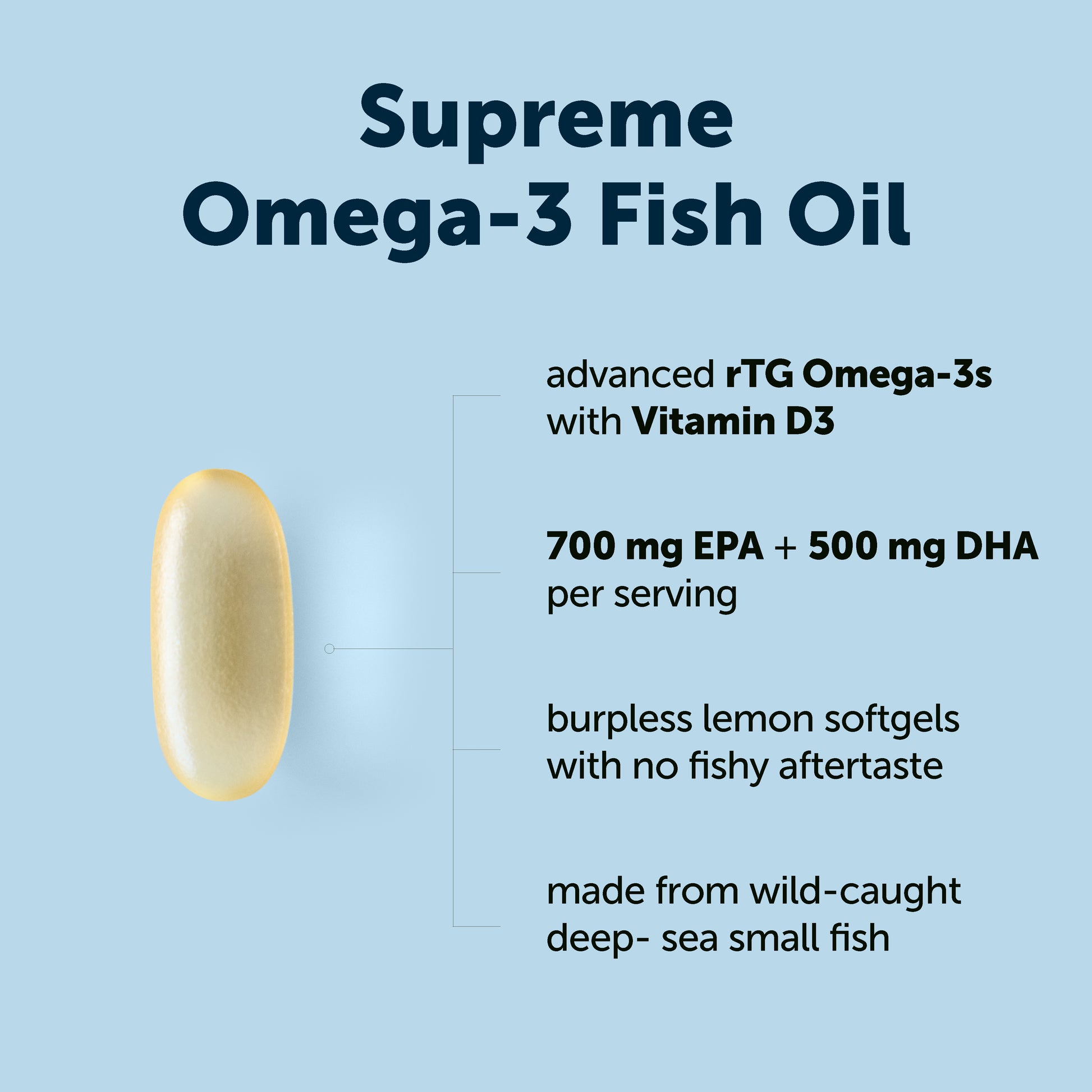 • Each serving delivers over 90% pure Omega-3s — 700 mg EPA and 500 mg DHA.