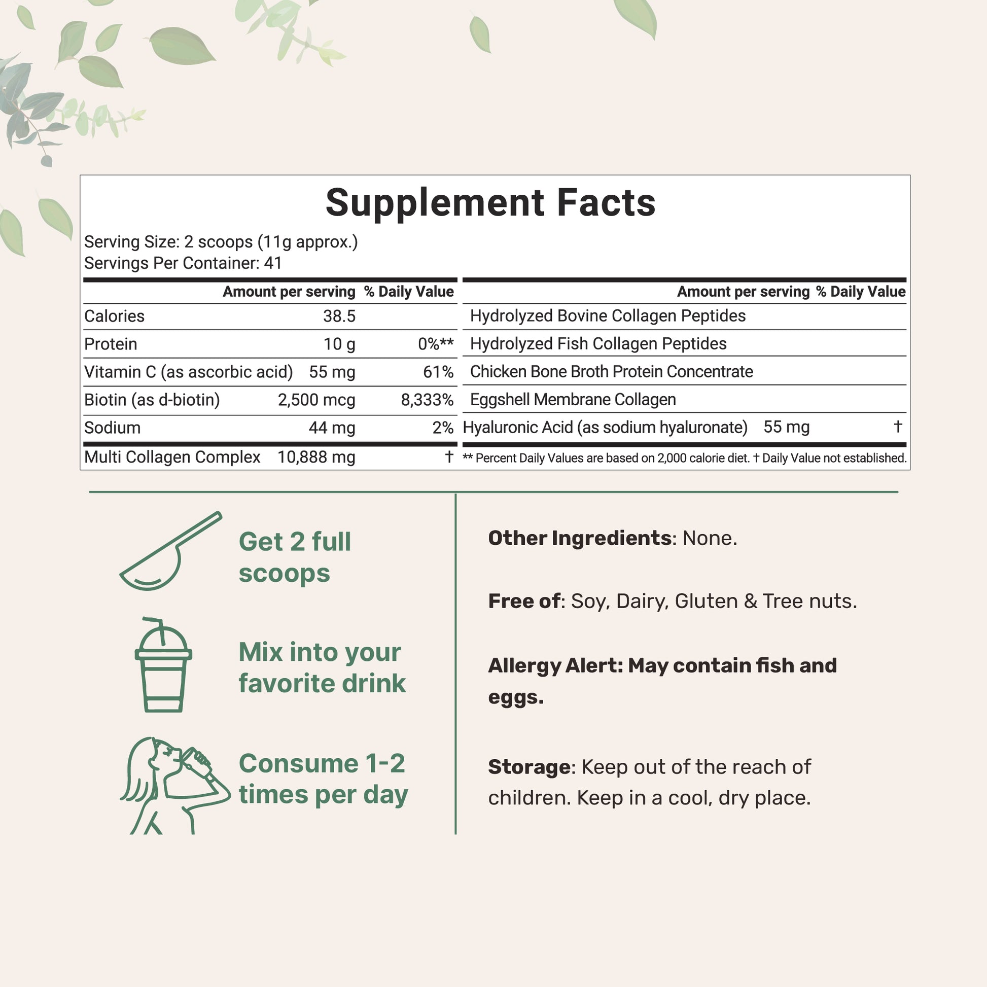 - A powerful unflavored multi-collagen complex that offers the most essential types of collagen including types I, II, III, V, and X. Mix it into any of your favorite drinks and replenish your body with top grade collagen from natural sources including bovine, chicken, marine, and eggshell membrane.