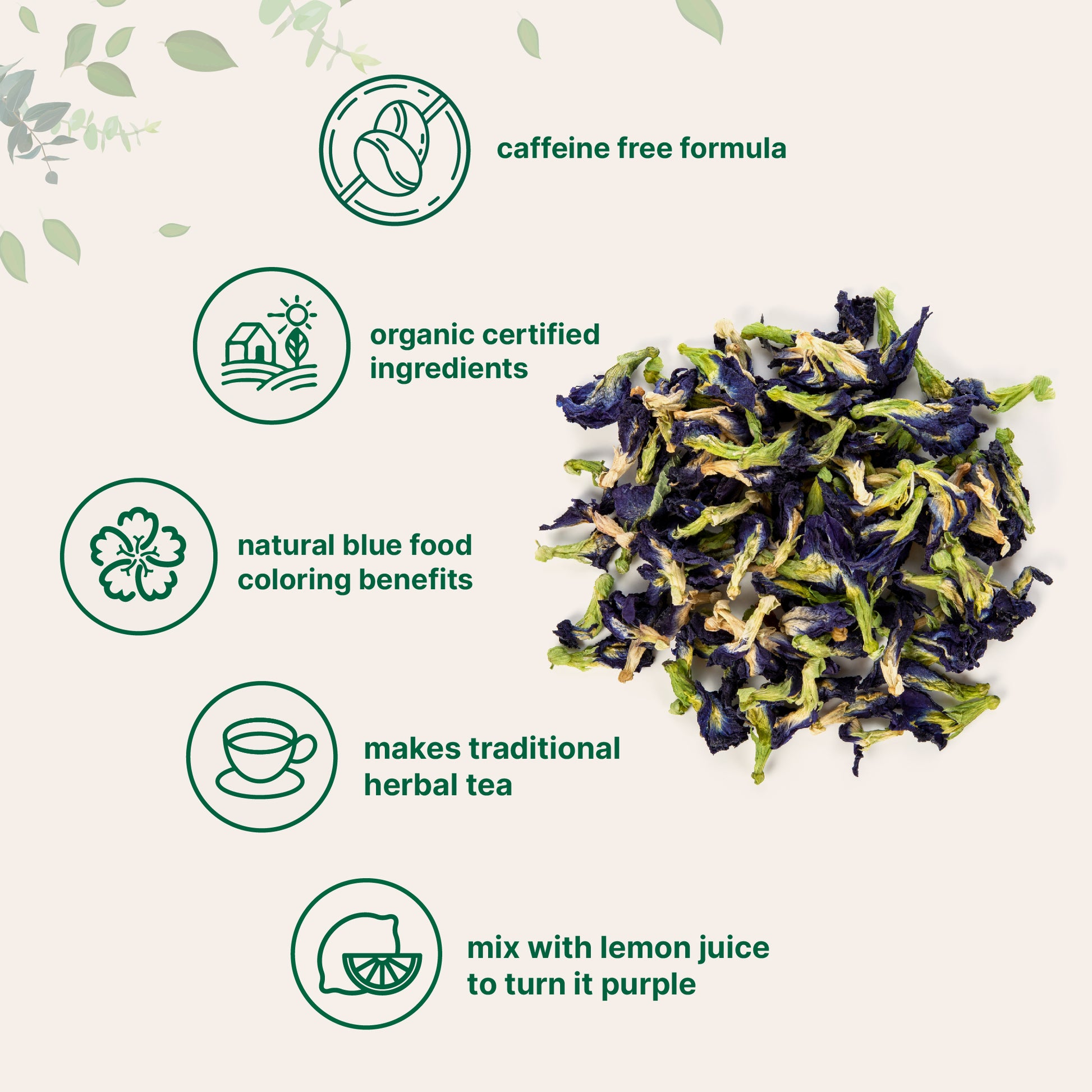 - Micro Ingredients offers USDA organic certified butterfly pea flowers, fresh raw flower source, makes traditional herbal iced or hot brewed tea, does not contain caffeine.