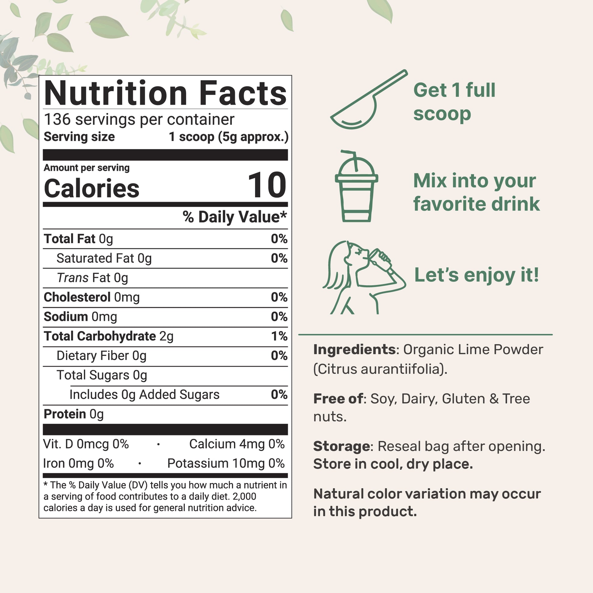 · Micro Ingredients offers Organic Freeze-Dried Lime Powder, 1.5lb supply with 136 servings per pouch. Each 1 scoop serving provides approximately 5g of lime powder as Citrus Aurantiifolia.