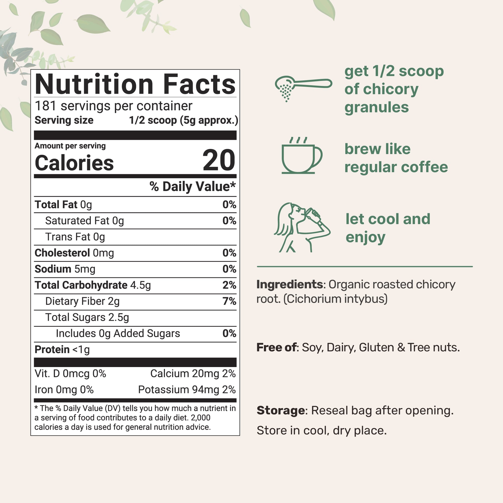 · Enjoy a rich and satisfying cup with just 1/2 scoop per serving, delivering approximately 5g of raw, nutty, earthy, and subtly floral chicory granules. A less acidic option compared to regular coffee.