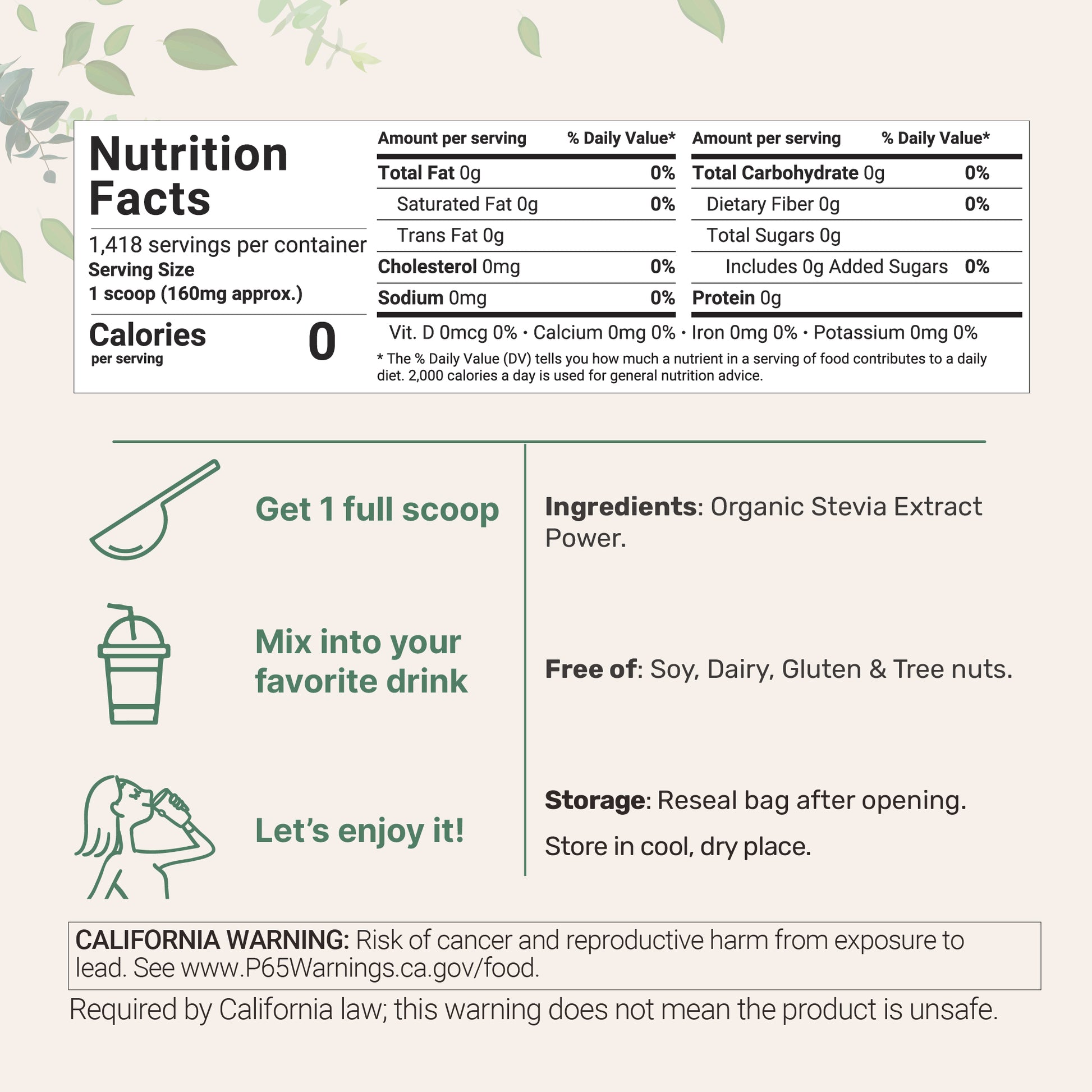 - 1 Teaspoon of Stevia Sweetener can Have Similar Sweetening Power as a Whole Cup of Sugar, Stevia Powder Organic, Best Source for Stevia Baking and Stevia Drinks.