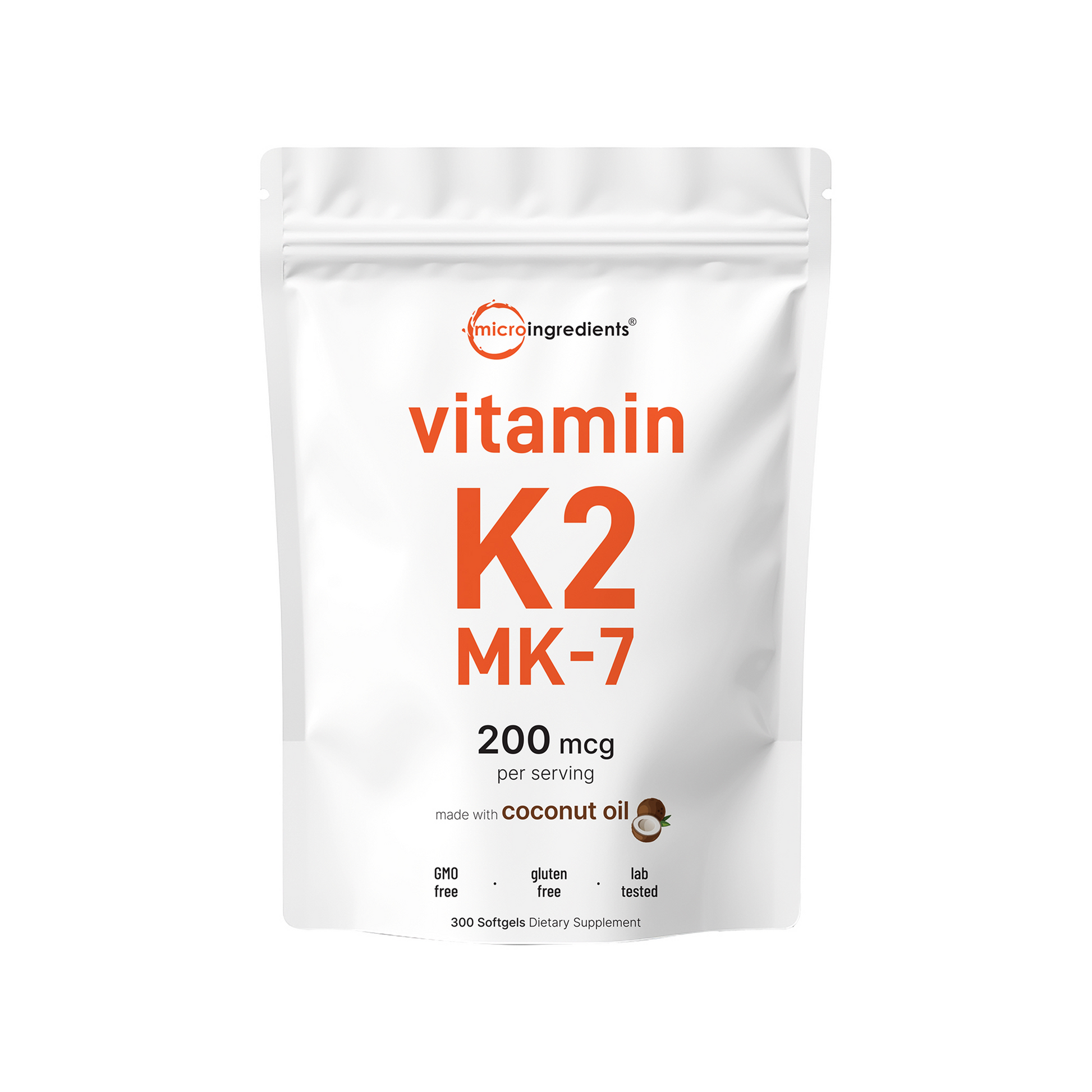 - Each pouch offers 300 coconut oil infused softgels that come in a convenient one a day formula. You can enjoy 200mcg of vitamin K2 as MK7 per dose, which lasts up to a 10-month supply.